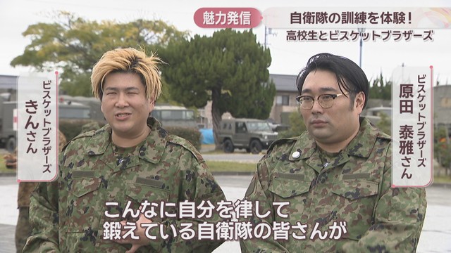 陸上自衛隊・善通寺駐屯地で訓練を体験したのは、尽誠学園高校の生徒5人と地元ゆかりの人気芸人「ビスケットブラザーズ」の2人です。