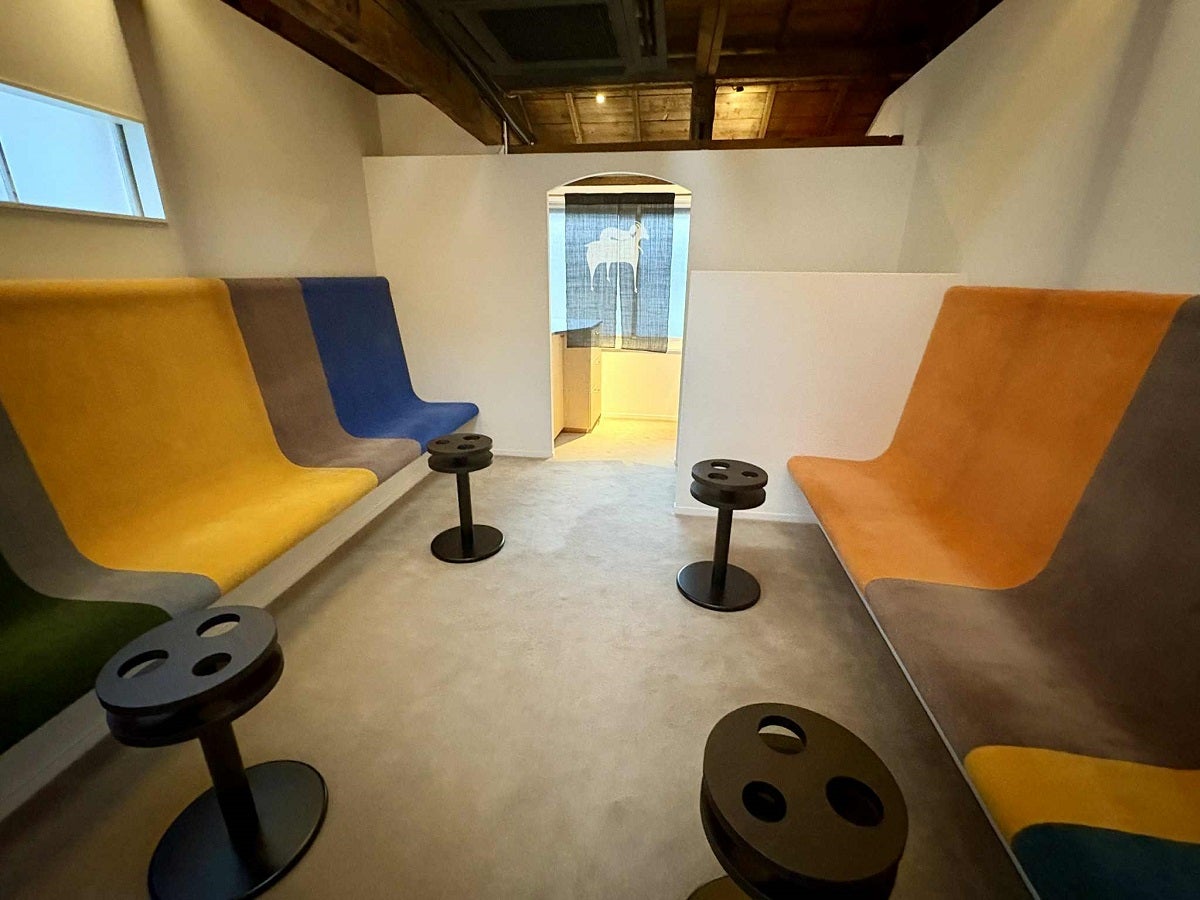 素足で絨毯の密度を感じることのできる、休憩室。夏は涼やかに、冬は床暖房の上でも使用可能