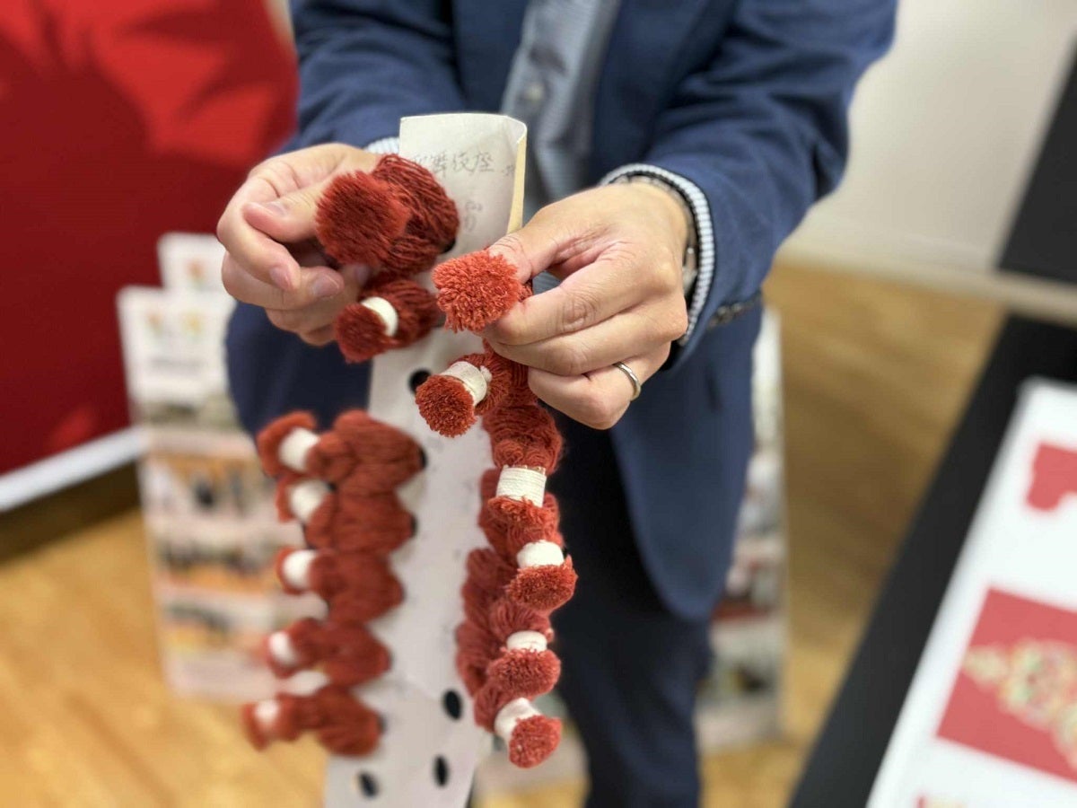 平等院鳳凰堂の文様をモチーフにした鳳凰柄だけで縦5m、横9m、毛糸の量1トンを超える 使用色は22色、試染は約100色 約2年半で完成