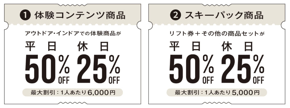 「アウトドア・インドア体験商品」と「スキーパック商品」で割引上限額が異なる