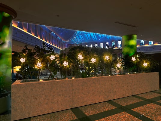 本作品は結・流・環をテーマに、やんばるの森や海の「見えない自然のリズム」、自然と生命の循環や繋がりを感覚的に再発見できる体感型ライトアートです。また、展示期間中のロビーラウンジでは、やんばるに焦点を当てたオキナワンカクテルが楽しめる他、クリスマスにはハイティーもご用意しています。当ホテルのコンセプトを体現する環境音楽「AMBIENTAL」を聴きながら、アート作品とともにこの場でしか体験できない贅沢な時間をお過ごしください。