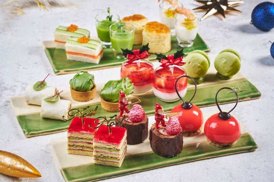 やちむん工房「ARTIGIANO」特製プレートで楽しむ限定コラボレーションハイティー。パティシエが手掛けるクリスマススイーツとシェフ自慢のセイボリーをやんばるの植物にかこまれた緑あふれる空間でお楽しみいただけます。