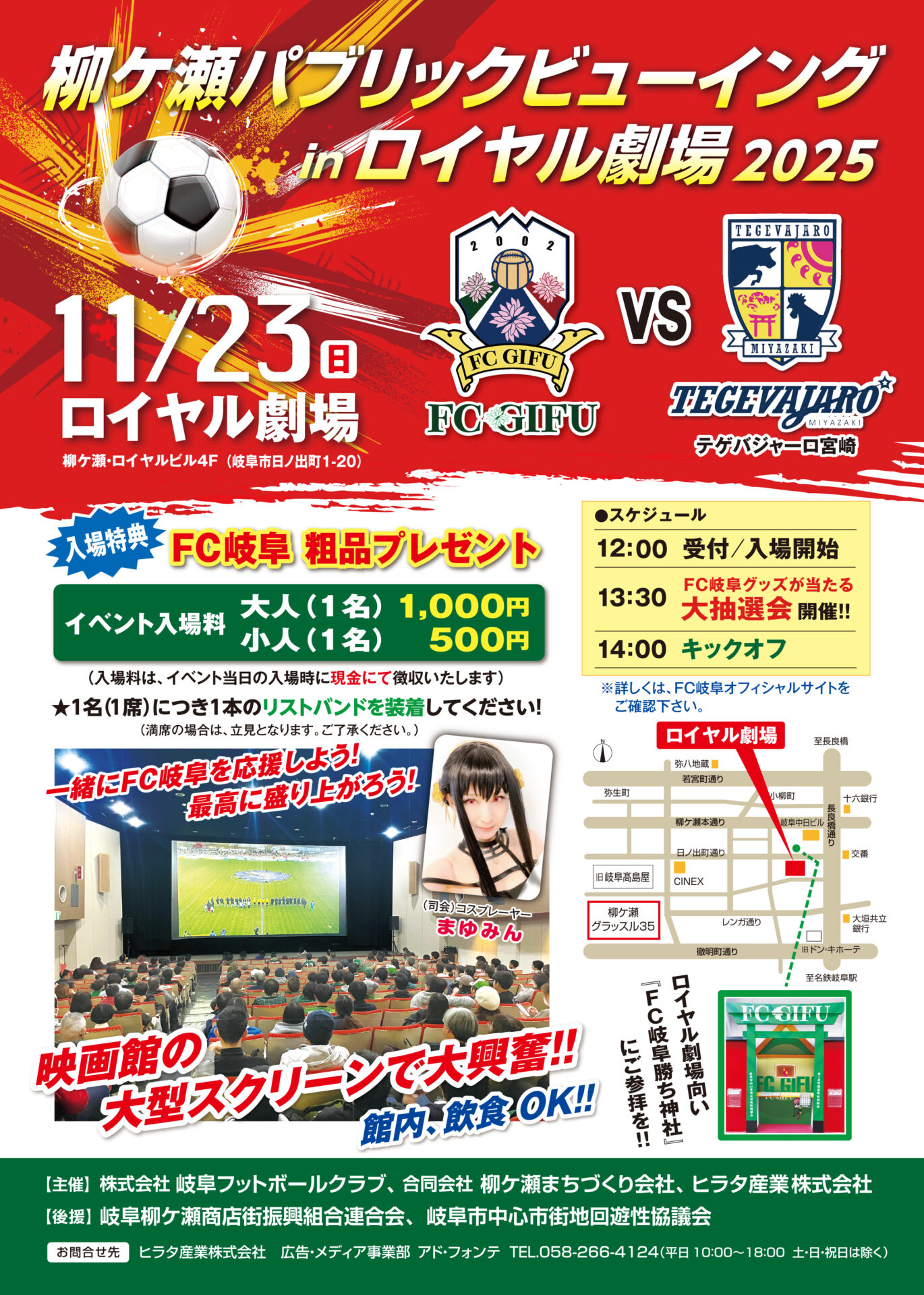 11月23日(日・祝)に岐阜市の柳ケ瀬商店街内にある映画館「ロイヤル劇場」にて、テゲバジャーロ宮崎戦のパブリックビューイングを開催しますので、お知らせ致します。