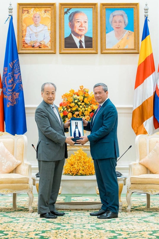 The presentation was made through the Japan-Cambodia Association (President: Fumiaki Takahashi), with the president himself handing the bottle to the Prime Minister.