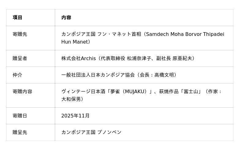 株式会社Archis(https://archis.co.jp/)(本社:山口県山口市、代表取締役:松浦奈津子)は、2025年11月、山口県発の長期熟成型ヴィンテージ日本酒「夢雀(MUJAKU)」(https://mujaku.jp/)を、カンボジア王国 フン・マネット首相(Samdech Moha Borvor Thipadei Hun Manet)に寄贈いたしました。