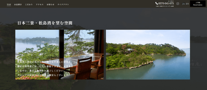 松島湾に浮かぶ島々と季節で表情を変える美しい景色を、静かな特等席からゆったりと堪能できるイメージを動画や言葉で直感的に伝えています。