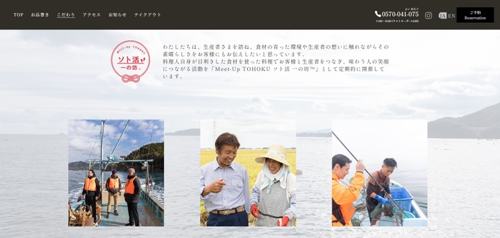 かきとあなご専門店である田里津庵の料理は、田里津庵料理長をはじめ、一の坊グループ各ホテルの料理長がアイディアを出し合い、食材から調味料、調理まですべてを検証しながらメニューの考案を行っています。そのため今回のリニューアルでは、こだわりが詰まった料理を松島湾の絶景とともにいただく体験価値を丁寧にお伝えすることを目指し、社員だからこそ伝えられる想いをサイトに込めました。