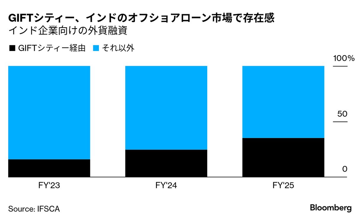 これは世界全体でインド企業に供与されたドル融資の3分の1余りに相当する。GIFTシティー経由のシェアは2年前、16%にとどまっていた。GIFTシティーを監督する国際金融サービスセンター局(IFSCA)のデータが示している。