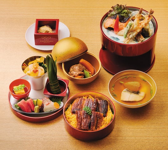 優雅三段膳香ばしい鰻丼を主役に、天ぷらや造りなどを美しく詰め合わせた特別な三段膳です。日本料理「KIZAHASHI」のシグネチャーであるこだわりの出汁を味わうお吸い物と共にお楽しみください。