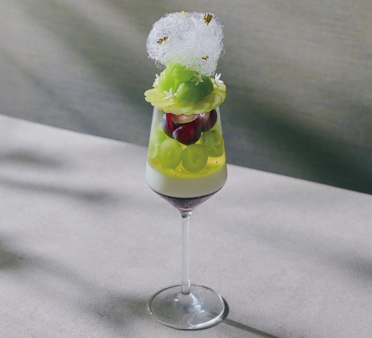 シャインマスカットと赤葡萄の秋パルフェ杏仁ミルクプリンに赤葡萄・マスカットのジュレを層に重ね、繊細にカットしたシャインマスカットを飾ったパルフェ。トップには華やかな飴細工をあしらいました。