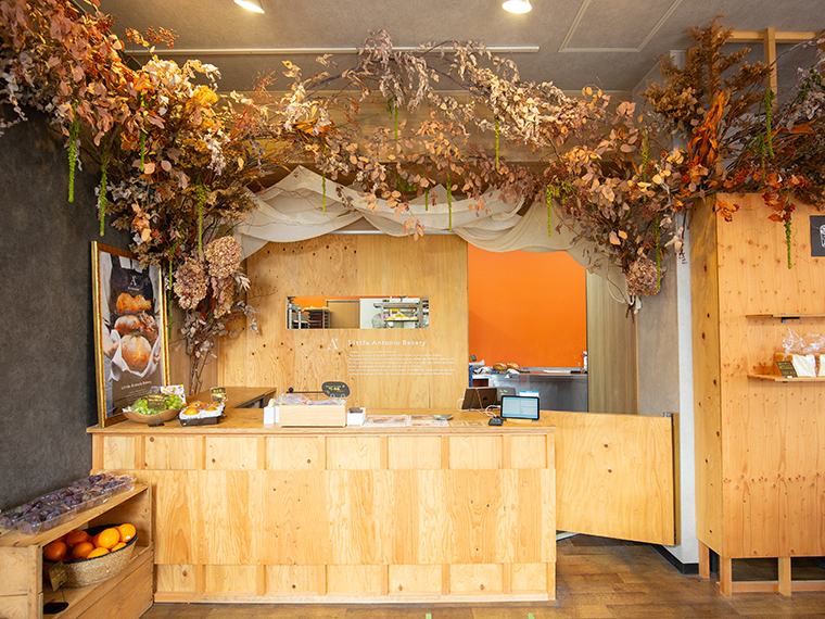 フラワーアトリエ『Sai Sai Ka』が手がけるドライフラワーが目を引く店内。自社農園や契約農家直送の果実を使った名物の「フルーツデニッシュ」も登場予定なのでお楽しみに。
