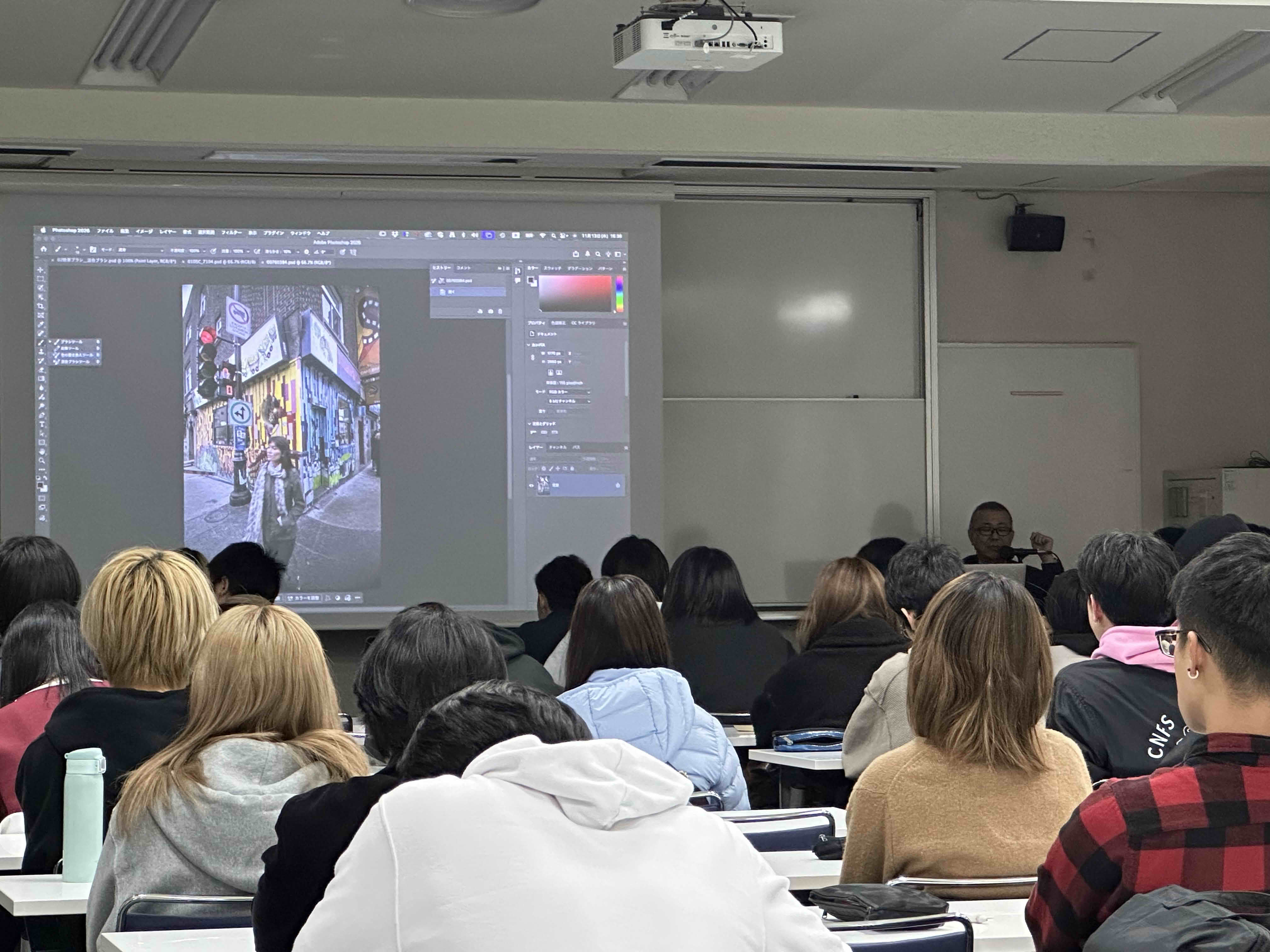 ビジュアルデザインの大里教授が、PhotoshopやIllustratorのプロ向け機能を実演しながら、デザインの可能性を紹介しました。