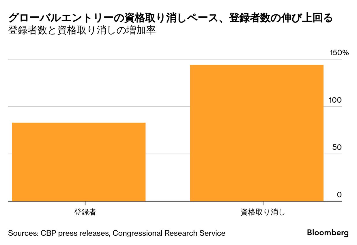 CBPは既存の登録者に対し定期的に審査を行い、資格要件を満たしているか確認している。これまでは登録取り消しはまれで、ブルームバーグがCBPのデータや発表資料を分析したところでは、過去には毎年約1000人に1人程度しか資格を失っていなかった。主な理由は刑事事件での訴追や保安検査場への銃持ち込み、またグローバルエントリーの場合は未申告の果物や野菜の持ち込みといった農産物に関する違反などだ(ただCBPのオンブズマン事務局は、一定の条件下で例外を認めることができる)。