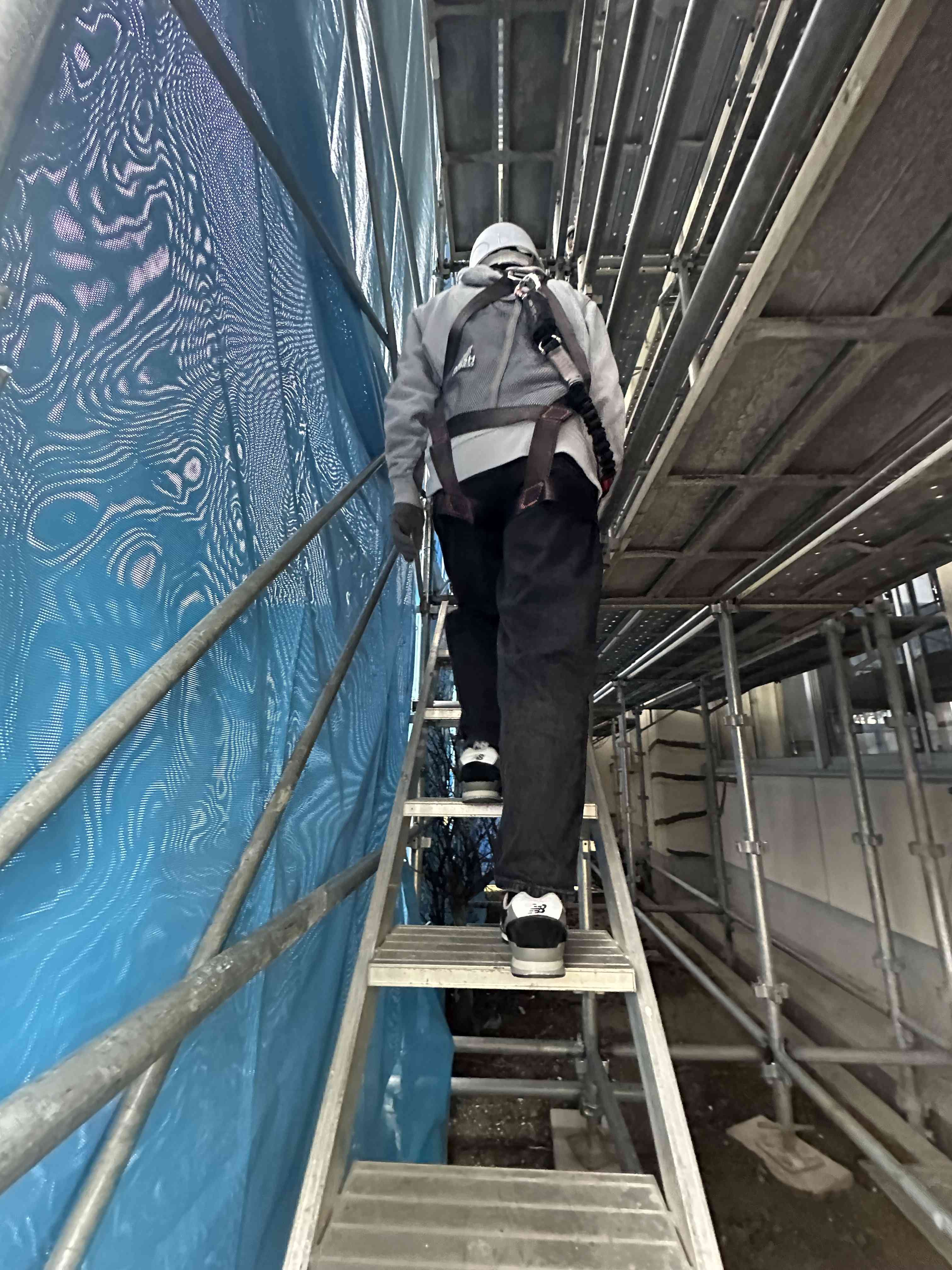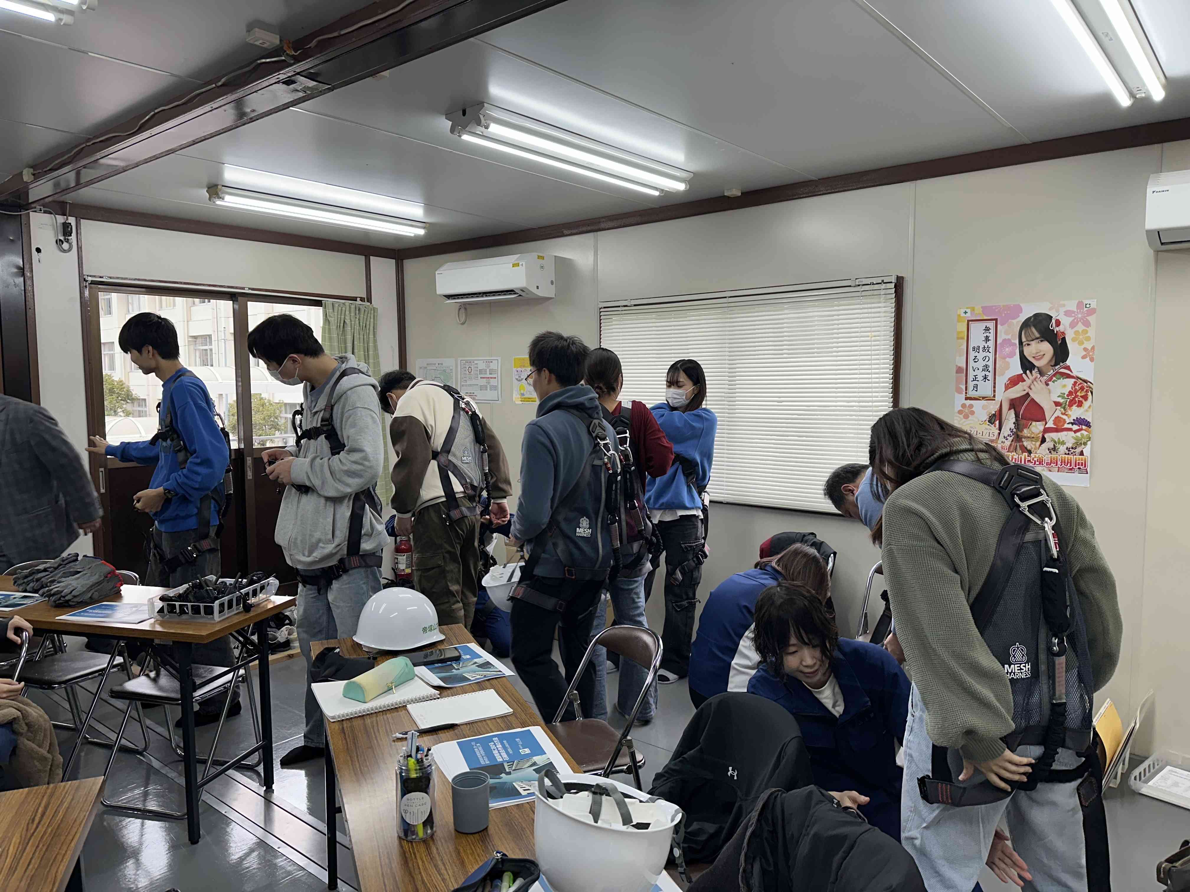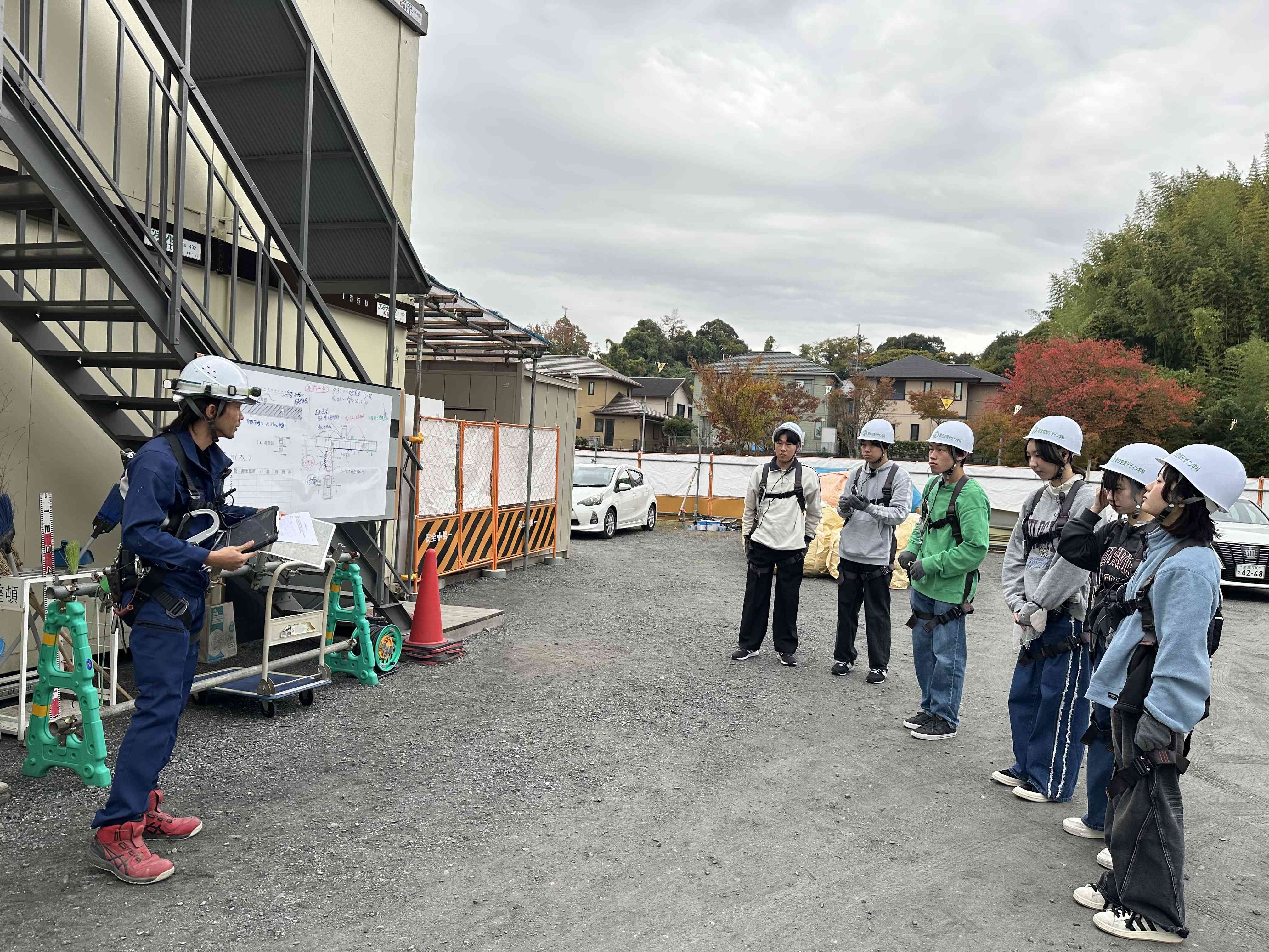 ハーネス型安全帯やヘルメットを着用し、実際の工事現場に入り、施工管理者から業務内容やアスベスト除去の対応方法について直接説明を受けました。