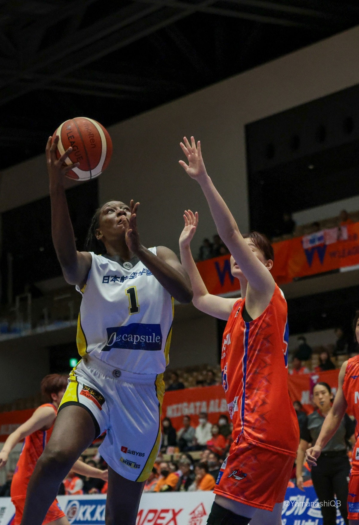 第2クォーターに入ると、流れが変わる。三好青花の3Pで同点に追いつくと、坂田侑紀奈のスリー、ダフェ ハディのインサイドで一気に主導権を握る。中盤には最大9点のリードを奪う展開となり、チームとしてリバウンドへの意識も高まった。しかし、ホームでファン・ブースターの熱い声援を背にして戦う新潟も粘り、柳瀬や中道の連続得点で追い上げると、終盤には再び逆転。QBはディフェンスで踏ん張り切れず、32-35で前半を折り返した。