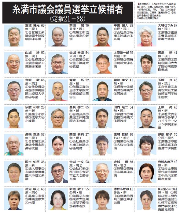 市議選には現職16人、前職1人、新人11人の計28人が立候補している。開票は16日午後9時から、シャボン玉石けんくくる糸満で行われる。市選管によると作業終了は17日午前0時の予定。
