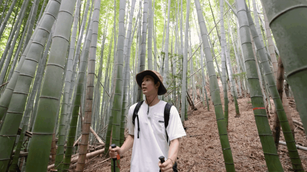 再出発するとしばらくは鬱蒼と茂った笹の間を進んでいくことに。季節的に蜘蛛の巣が多い時期。それを払いながら笹を漕ぐようにしてひたすら下ってゆくと、やがて道の分岐点へ。ここからもう一度登り道が始まり、その先には神社があるようです。あたりの様子も変化して、いつしか背の高い竹に囲まれていました。その深い竹林の奥へと道は続き、すでに隣の山が始まっているのだということに気づきます。
