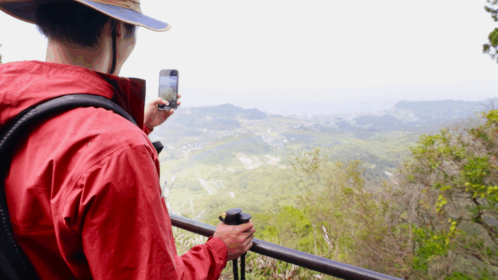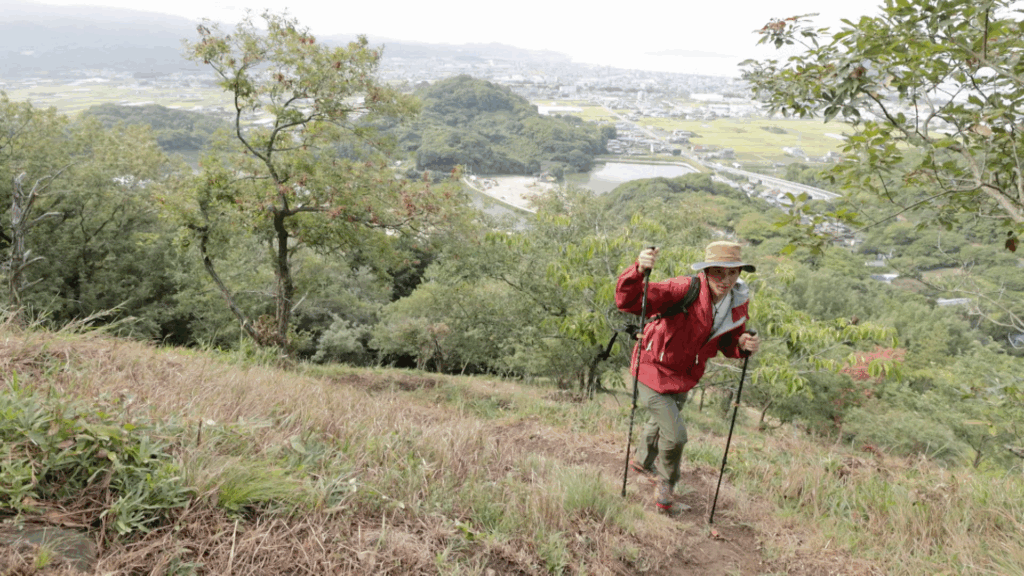出発してわずか50分で腰折山の山頂、標高214mに到着した近藤さん。「田んぼが見えて、人里が見えて、海が見えて、高い建物がないからみんな見通せる!」と景色に感激しつつ、ここで一旦休憩。スープジャーに入れてきた、冷やしシャインマスカットで糖分補給です。さすがフルーツ王国の愛媛県、思わず顔が綻んでしまいますね。この先、隣の恵良山へは一度80mほど下って、そこから170mほど登り直すことになります。