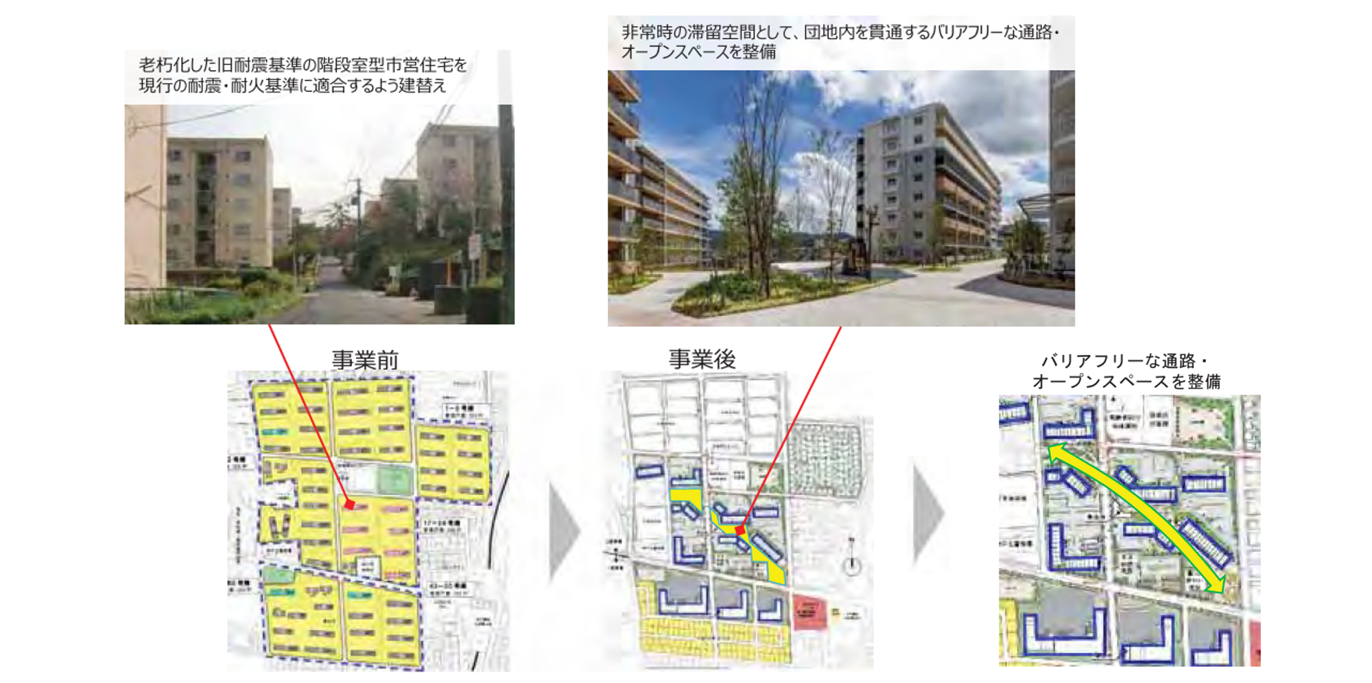 老朽化した公営住宅を現行の耐震・耐火基準に適合させることにより、地震発生時の建物被害を防止し住民の安全を確保するとともに、団地内にバリアフリーな通路を整備することで、非常時の避難行動がより安全なものとなります。