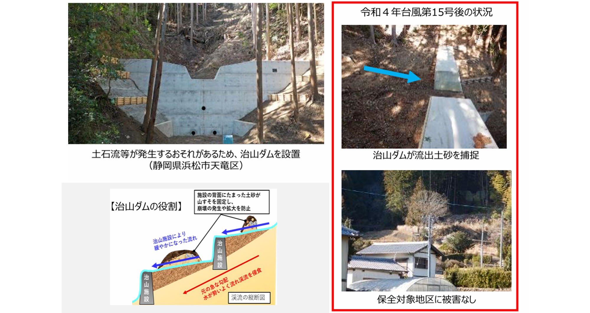 土石流等の発生リスクが高い箇所に治山ダムを設置するもので、令和4年台風第15号時に治山ダムが流出土砂を捕捉したほか、天竜区全体の山地災害被害額が平成30年7月豪雨時に比べて低減しました。