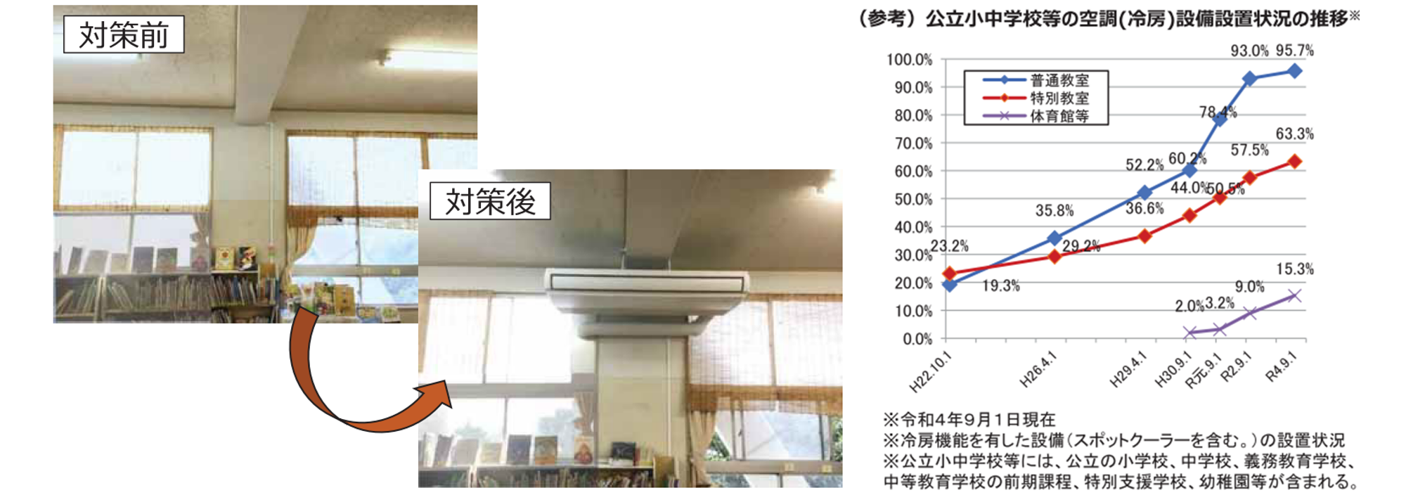 学校施設は、児童生徒の学習・生活の場であるとともに、災害発生時には避難所として活用されることからも、空調設備の整備は重要な課題となっています。