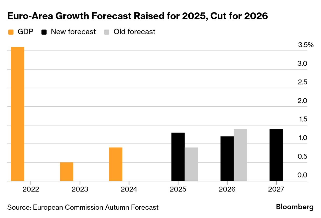 欧州委員会の見通しは、欧州中央銀行(ECB)や国際通貨基金(IMF)の最新予測よりも楽観的だ。EUの政策担当者は、域内が貿易面で最悪のシナリオを回避しているように見え、インフレ率も2%近くで抑制されていることから、今後数カ月についての楽観的な見方を強めている。