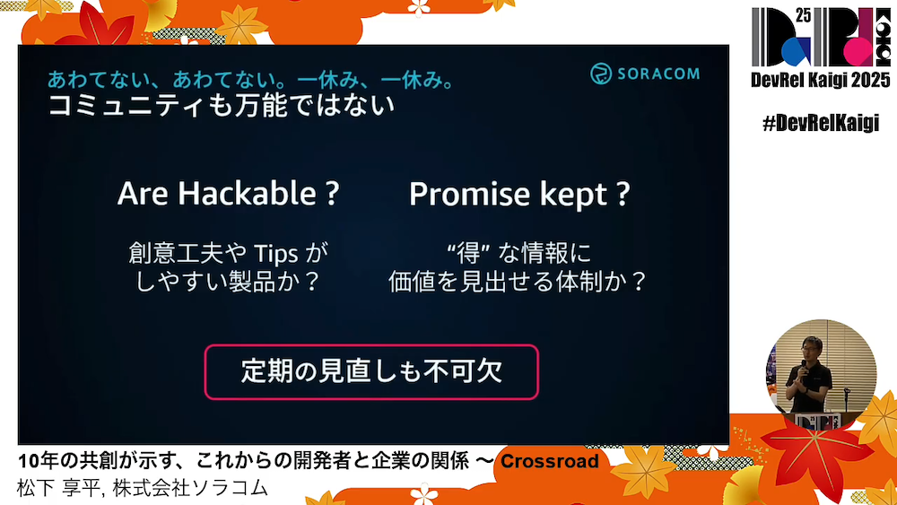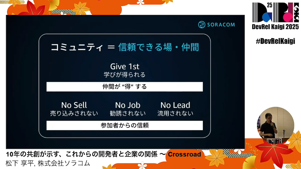 コミュニティは即時のリード獲得のためではなく、関わる開発者と現場の声を増やし、市場を拡大するための基盤であるというメッセージでキーノートは締めくくられました。