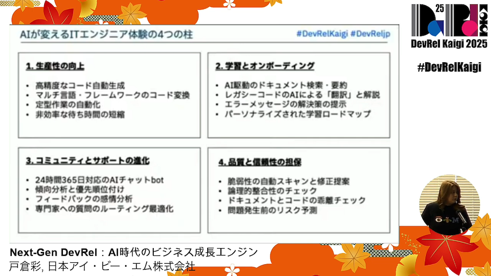 一方で、AIでは代替できない領域もあると明確に示されています。例えば、信頼の構築や共感に基づく文化づくり、意思決定の最終判断、交渉や責任の所在、倫理の担保といった点は人間同士の関係性が前提になると説明されました。これらはエンジニアと企業の間でDevRelが担うべき基盤的な価値であり、AIはそれを補完する道具であって置き換えるものではないというメッセージでキーノートは締めくくられました。