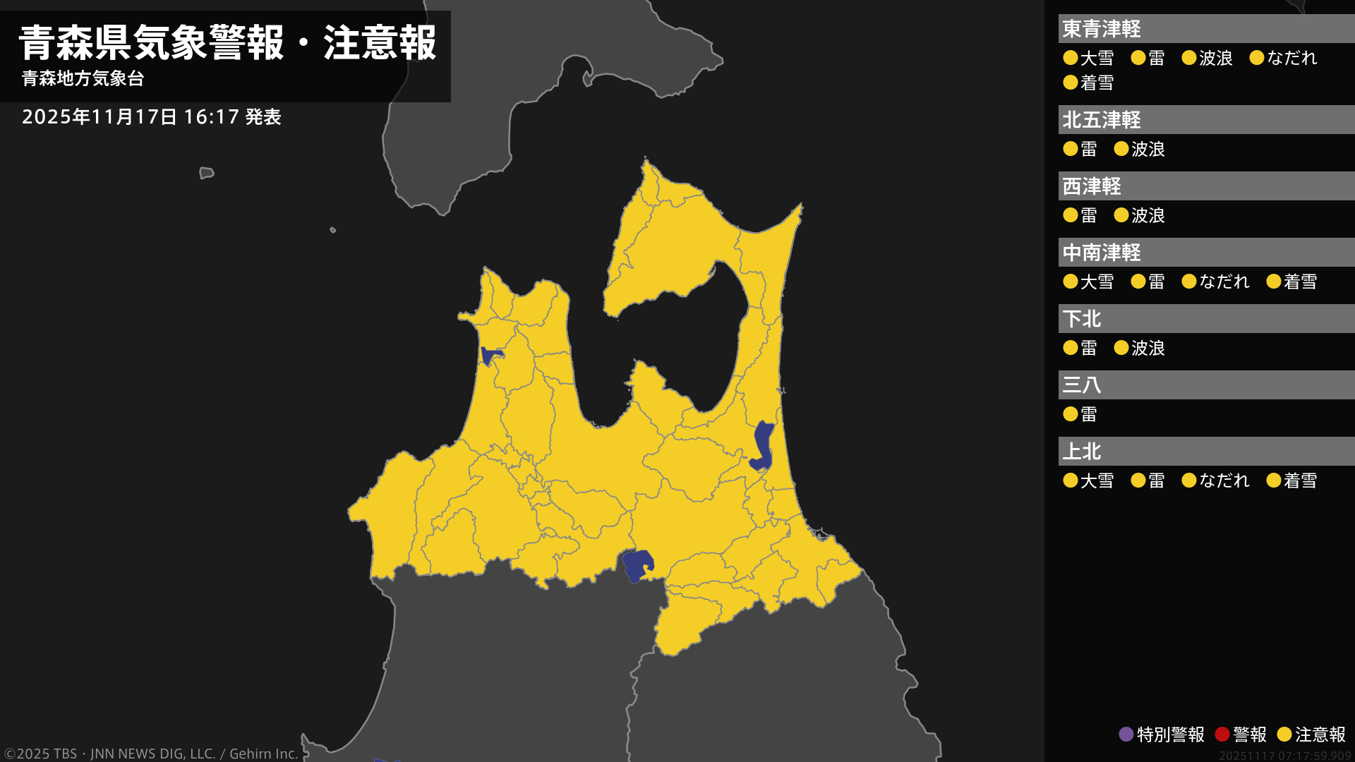 気象台は、午後4時17分に、なだれ注意報を青森市、弘前市、黒石市、十和田市、平川市、平内町、今別町、蓬田村、外ヶ浜町、西目屋村、大鰐町、野辺地町、七戸町、横浜町、東北町、六ヶ所村に発表しました。