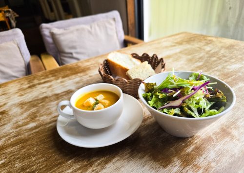 すべてのランチに「今週のスープ」「お野菜サラダ」「ドリンク」も含まれます。また、すべてのランチに、前菜、ミニデザートを付けることもできます。