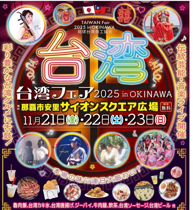 会場では、魯肉飯(ルーローファン)や台湾唐揚げ(ジーパイ)などの台湾グルメが販売されるほか、伝統芸能や音楽ライブも楽しめる。入場無料。琉球台湾商工協会の洪柏青会長は「本場の味や文化、雑貨が勢ぞろいする。ぜひ足を運んでください」と来場を呼びかけている。
