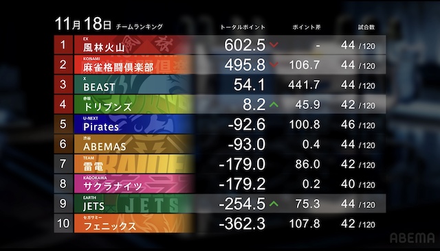 【11/18 Mリーグ2025-26 第1試合結果】滝沢和典が東場からダマテン高打点を連発してトップ獲得!10戦6トップで個人スコアも2位に浮上!
