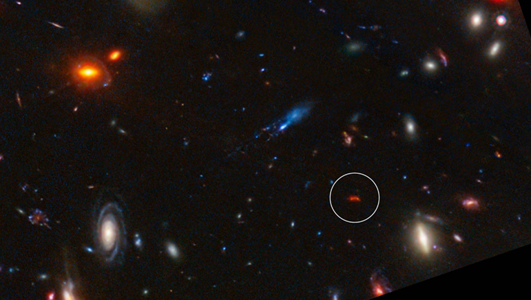 最遠方の星間塵が検出された銀河Y1(丸で囲まれた赤い色の天体)。背景はジェームズウェッブ宇宙望遠鏡で取得された画像(赤外線の波長を擬似的にカラーで表現)