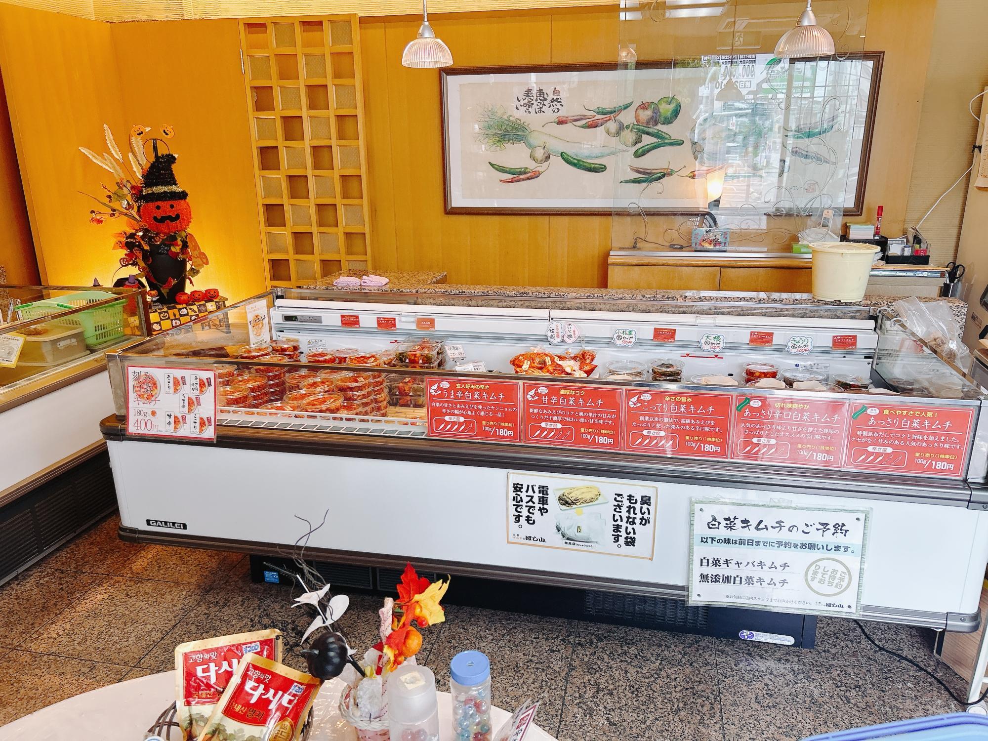 店内に入ると、ずらりと並んだキムチがお出迎え。看板商品である白菜キムチだけでも、「あっさり」「こってり」「甘辛」「うま辛」など、なんと7種類もの味が揃っています。これだけ種類が豊富だと、自分の好みにぴったりのキムチが見つかりそうですね。