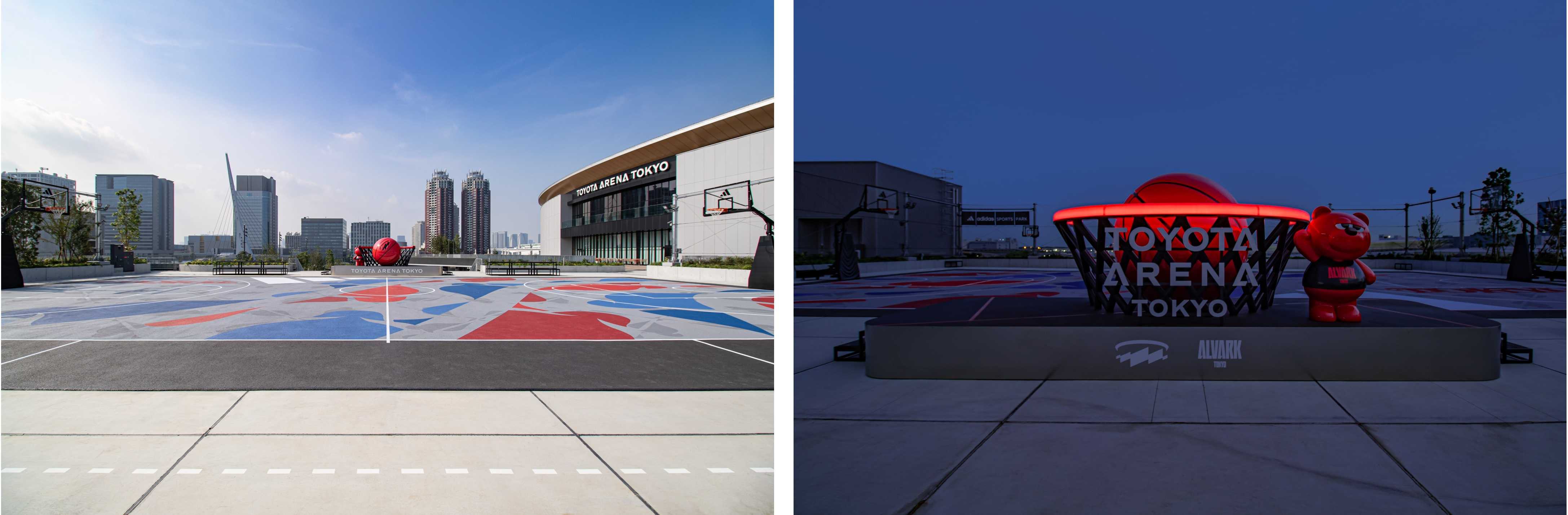 初めてバスケに触れる人から高いレベルでのプレーにチャレンジをする人まで、誰もがバスケットボールを楽しめる場所です。ストリートパークを連想させる金網(ゲージ)をイメージしたベースデザインの上に、世界的に活躍するペインター/アーティストのMHAK(マーク)氏によるアイコンを大胆に配し、アリーナと海、世界をつなぐ場所に位置するadidas スポーツパークを抜ける風を表現しています。コートの一部には不要になったシューズのゴム素材を再利用。選手やファンの想いが刻まれた、世界に一つだけのコートに生まれ変わりました。パーク入り口にある『TOYOTA ARENA TOKYOシンボルモニュメント』は、アルバルク東京が、ホームゲームで勝利した際は、ゴールリングが赤く点灯する仕掛けが施されています。