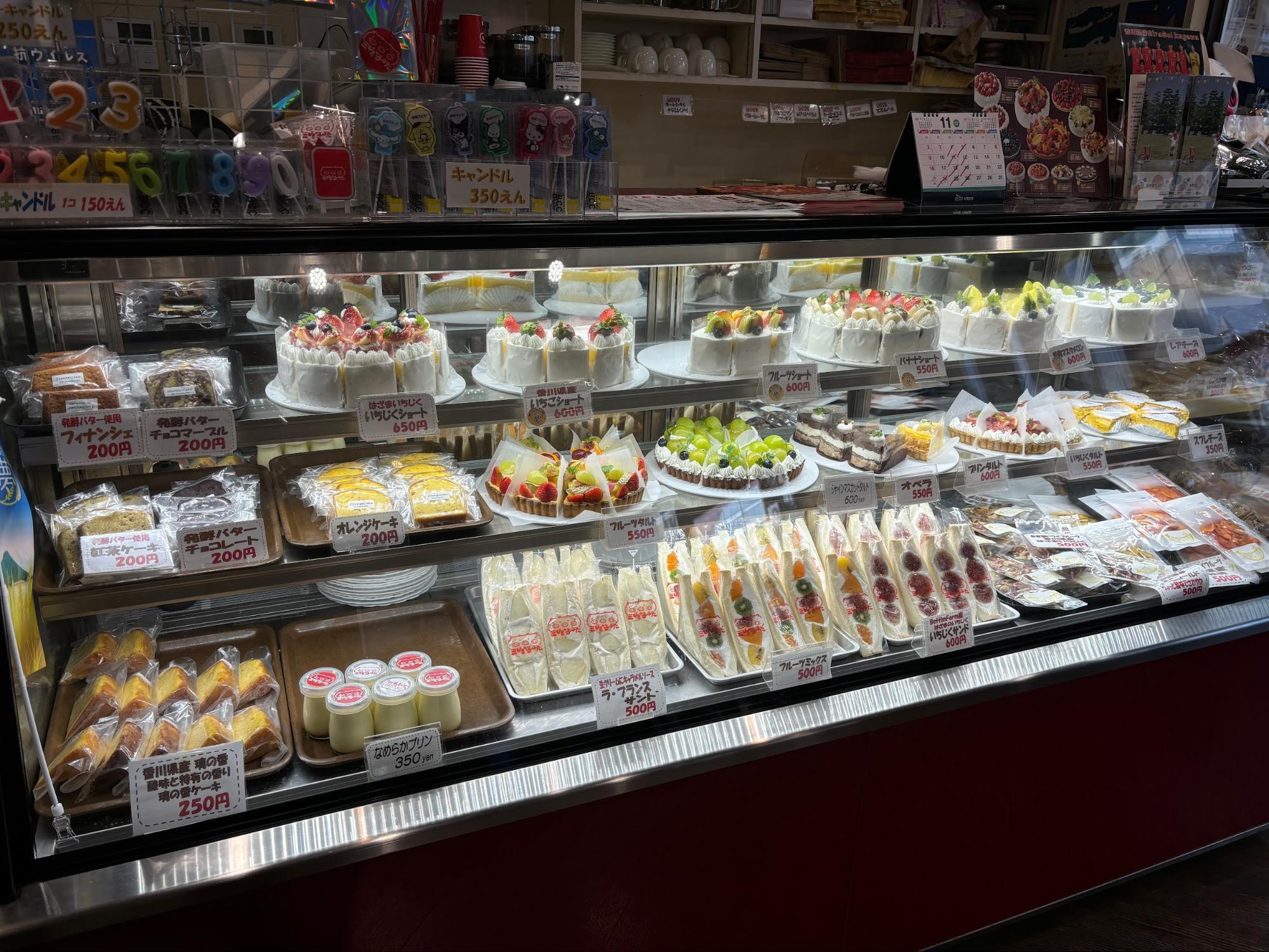 ショーケースには色とりどりのフルーツケーキがずらりと並び、見ているだけで気分が明るくなるようなラインアップ。