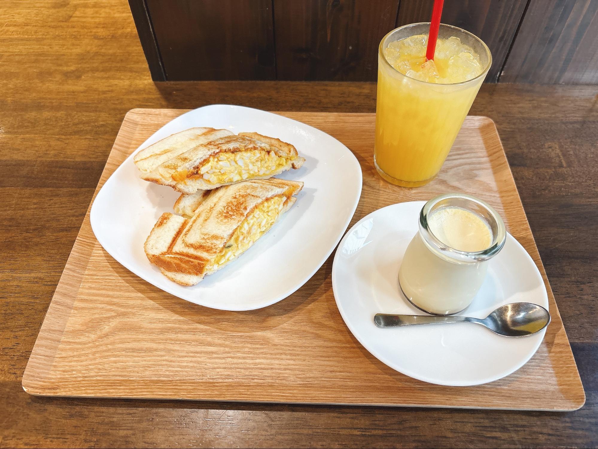 今回は、タマゴサンド(税込450円)、オレンジジュース(税込500円)、なめらかプリン(税込350円)をいただきました。
