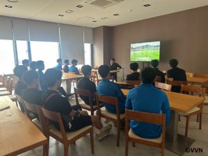 出発前には前日の試合の振り返りを⾏い、試合会場へ向かいました。