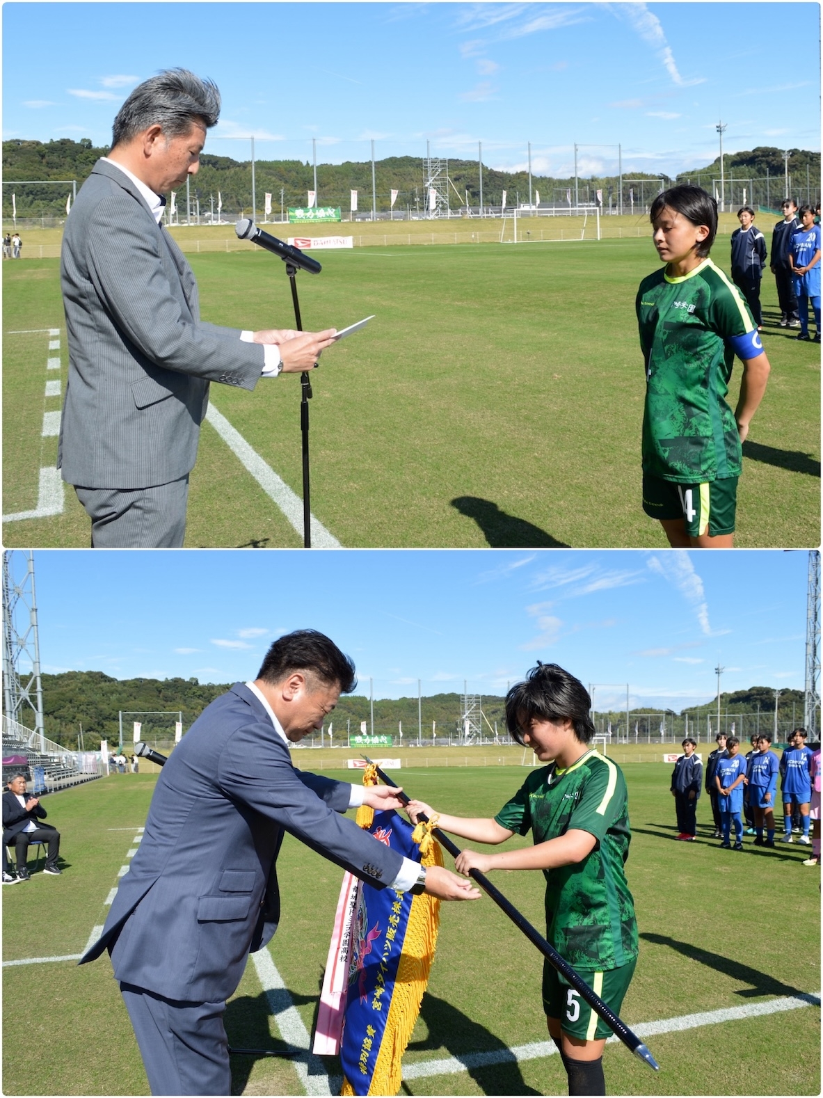 一般社団法人 宮崎県サッカー協会の斉藤了介会長は、「優勝した宮崎学園は、負けたチームの思いも背負って戦ってきてください。そして負けたチームは、悔しさを忘れずに練習に励んでほしいです。サッカーを通して仲間や監督、保護者、審判に感謝し、『足るを知る』人間となって宮崎のために活躍してください」とエールを送りました。