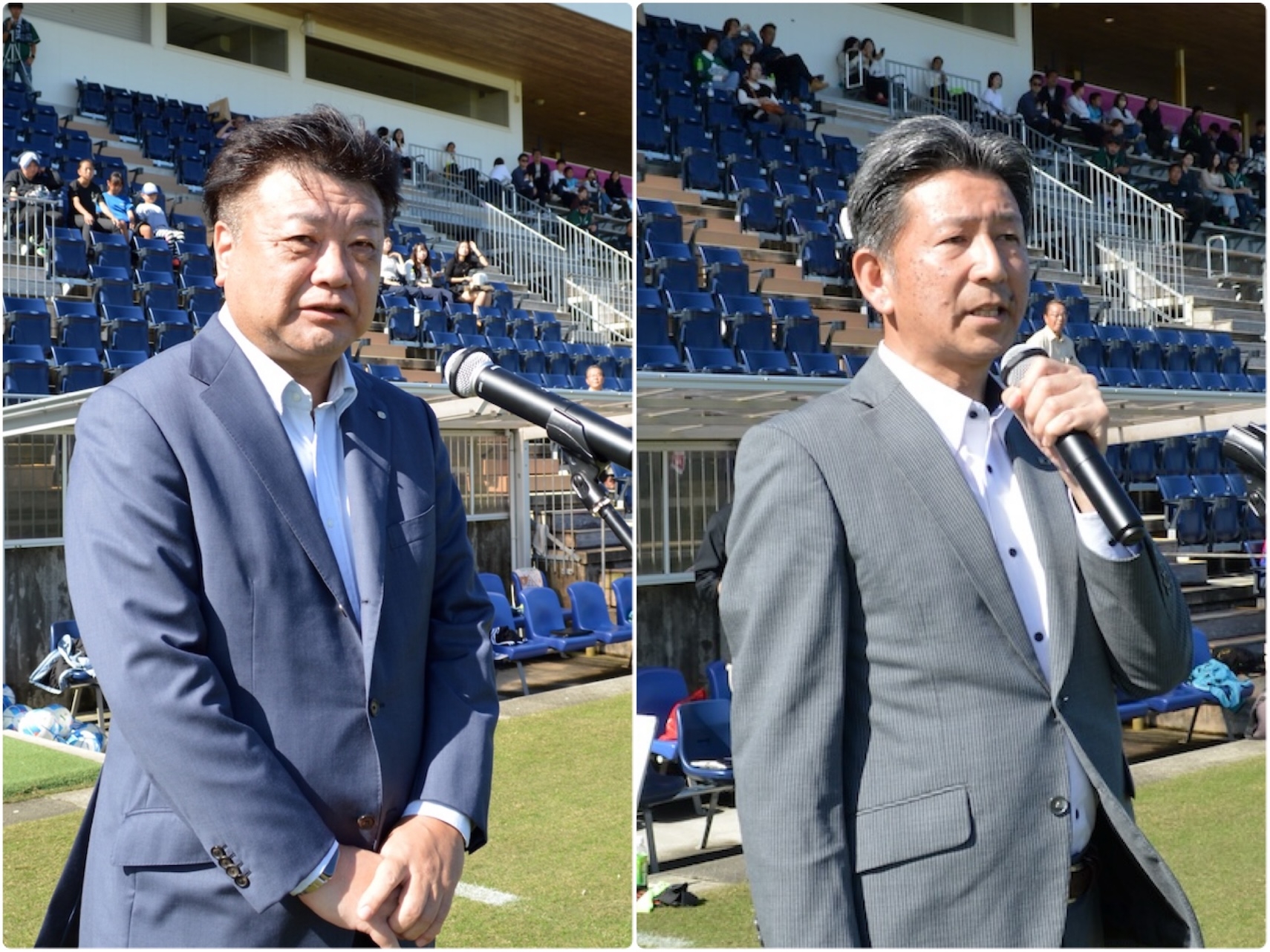 宮崎ダイハツ販売株式会社・春名友樹代表取締役社長(写真左)と一般社団法人 宮崎県サッカー協会・斉藤了介会長(同右)が挨拶