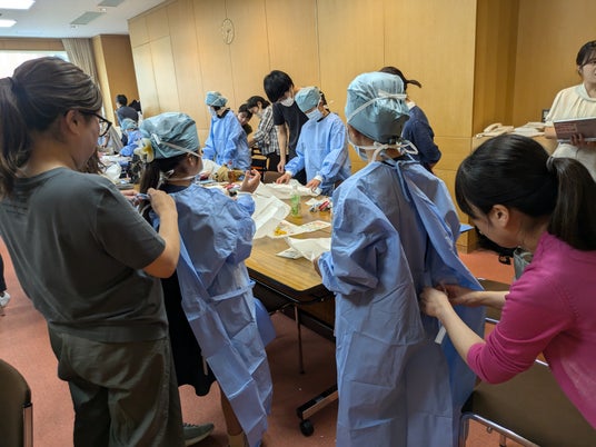 – 術衣の着用体験子どもたちは手術用の滅菌ガウンや手袋を着用し、本物さながらの医療現場を体験しました。