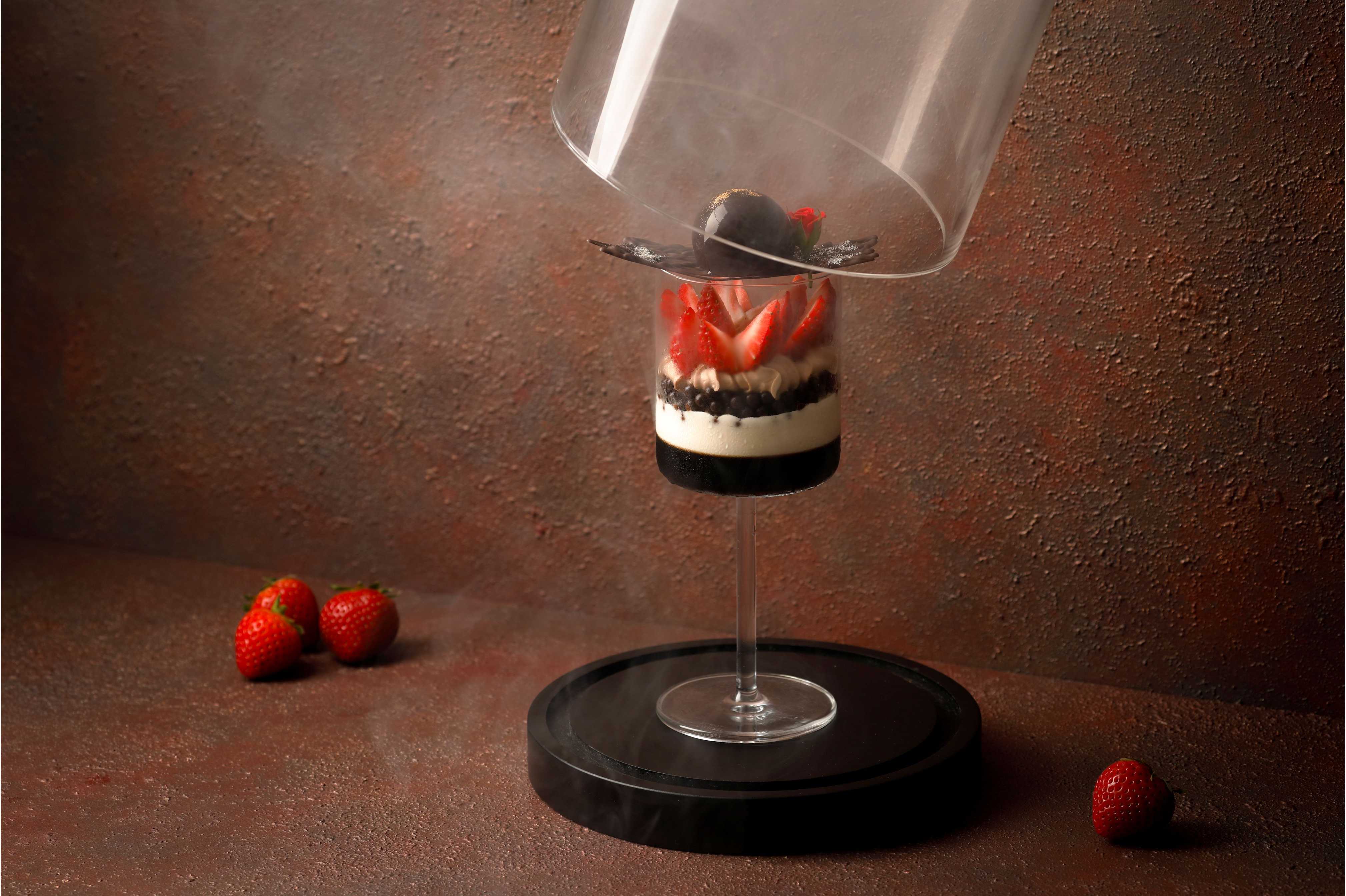 香りの演出には、剪定され廃材となった南高梅の木を使用したスモーク。燻製チップとして焚き上げた香ばしい香りがパフェ全体を包み、ビターで大人な味わいのパフェに仕上がります。グラスの中には紀州備長炭でローストしたコーヒーゼリーのほろ苦さや、まろやかなマスカルポーネ、パールクラッカーの軽やかな食感など様々なアクセントが口の中でやさしく広がります。さらに、上から温かいカフェエッセンスソースをかけることでパフェ全体に深みとコクが足され、五感で感じられる大人のスイーツとしてご堪能いただけます。