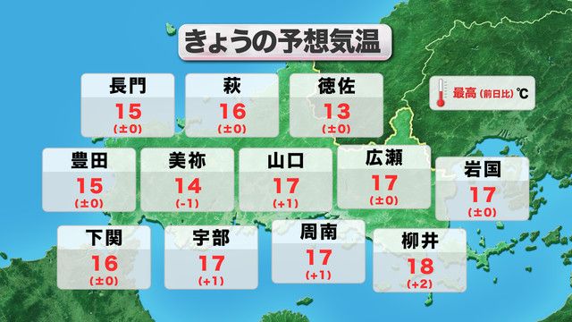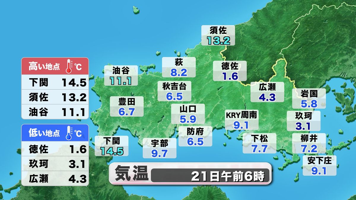 まだ少し残る寒気と夜中、晴れて放射冷却の影響が強まったことにより、今朝も少々冷え込みが強まる所が多くなりました。特に徳佐では1度台まで気温が下がりました。