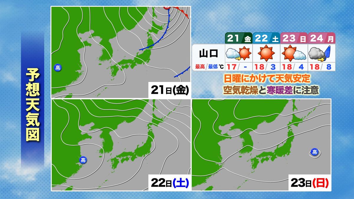 朝は冷え込んでいますが、昼間は日ざしの温もりが感じられる陽気になりそうです。きょう21日(金)は午後ほど快晴の時間も。さらに土~日曜日と引き続き高気圧に覆われて、穏やかな天気となる見込みです。昼間は日ざしが暖かな「小春日和」ですが、朝晩は放射冷却の影響で少々冷え込みが強まる、という少々激しい寒暖差と、天気が安定するぶん、まだ続く空気の乾燥にご注意ください。