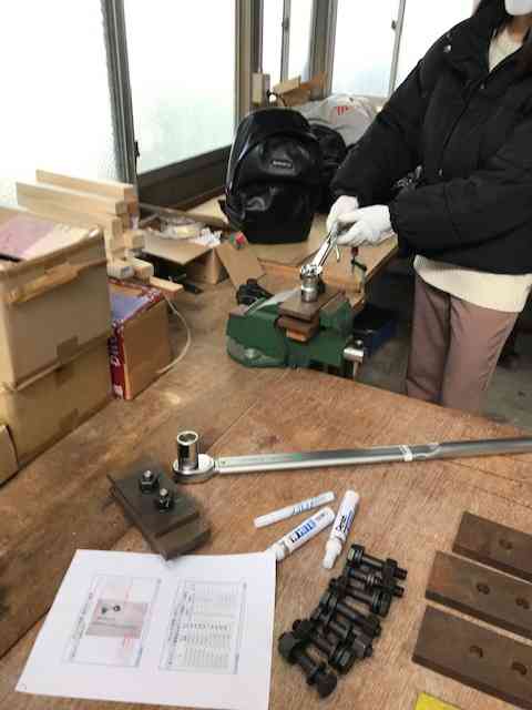 高力六角ボルトとトルシアボルトを使い、トルクレンチとシャーレンチによる締め付け作業を体験。