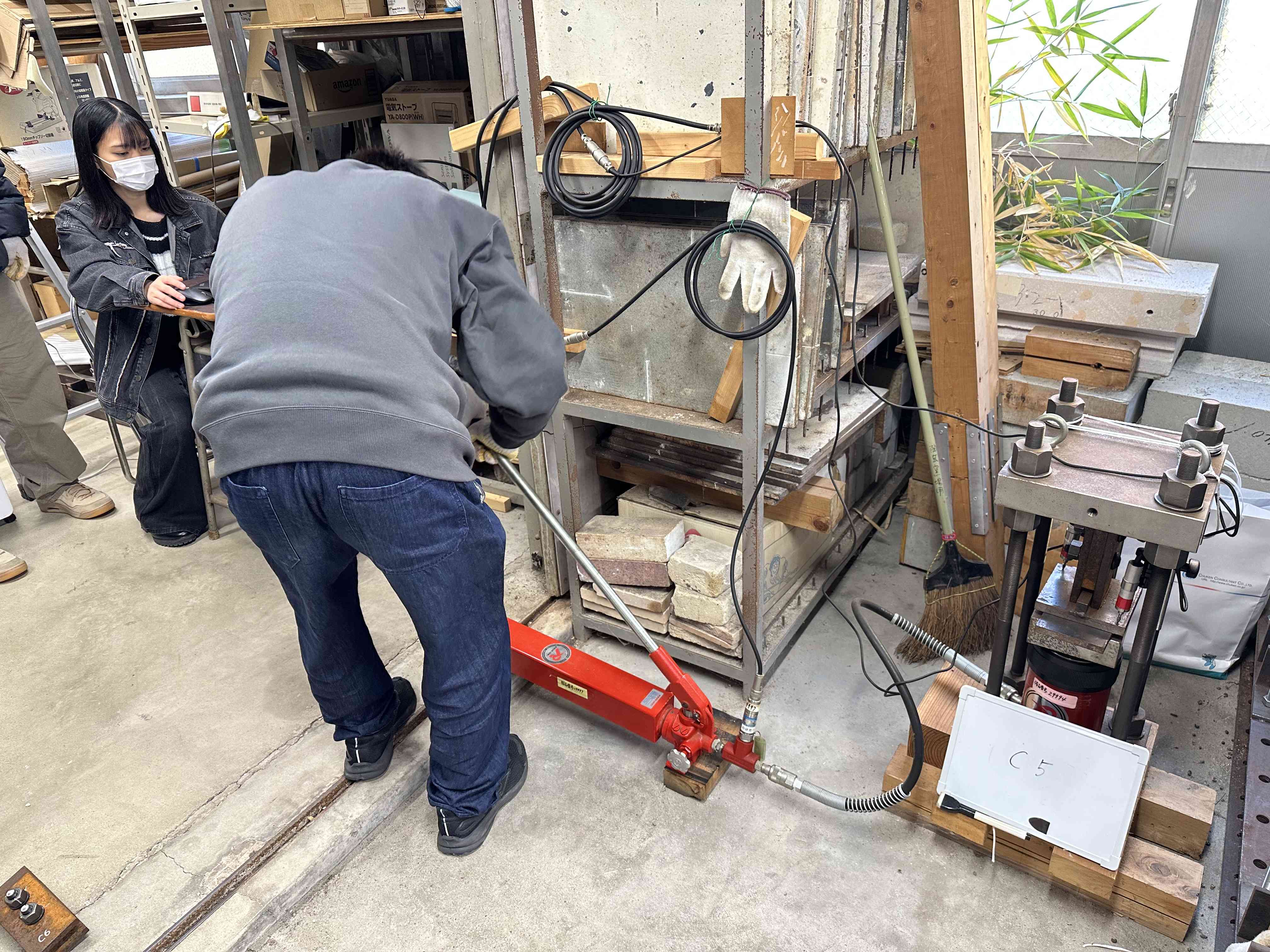自分たちで組み立てた試験体に油圧ジャッキで力を加え、荷重と変位のデータを収録しました。