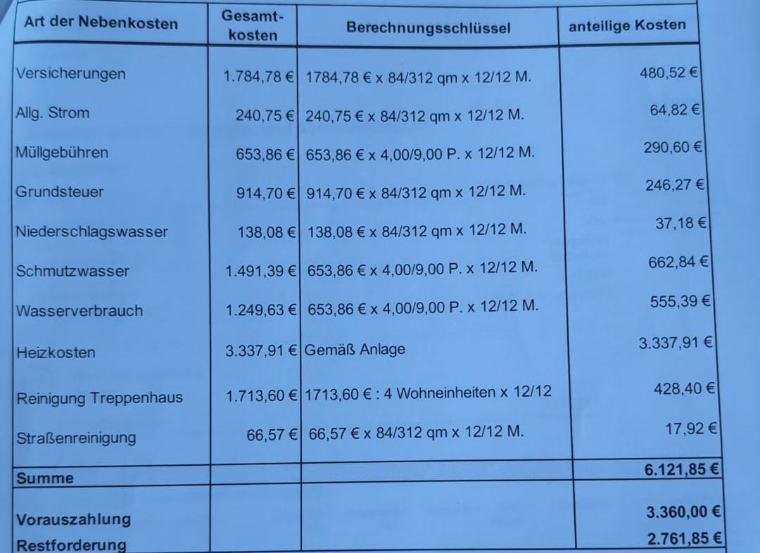 私たちが支払う合計家賃は 1010 ユーロ + 電気代とインターネット代で、別途支払います。今、私たちは毎年この請求書を受け取りますが、そのたびに、おそらく建物全体の消費量に相当するほどの暖房費がかかっています。 3500ユーロくらいですか?