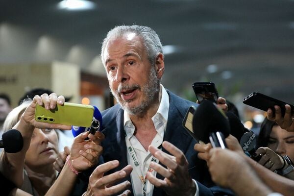 11月21日、記者に囲まれるCOP30のCOP30議長のアンドレ・コヘア・ド・ラゴ氏(写真:ロイター/アフロ)