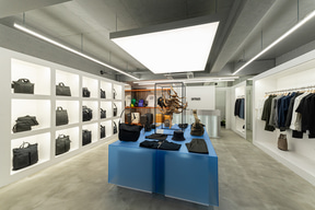 左右の壁にはバッグとアパレルのラインアップが揃う