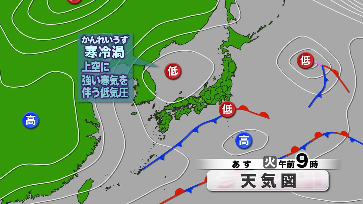 特に日本海の低気圧は上空に強い寒気を伴う、「寒冷渦」と呼ばれる低気圧で、この影響で、県内は大気の状態がかなり不安定となってきます。